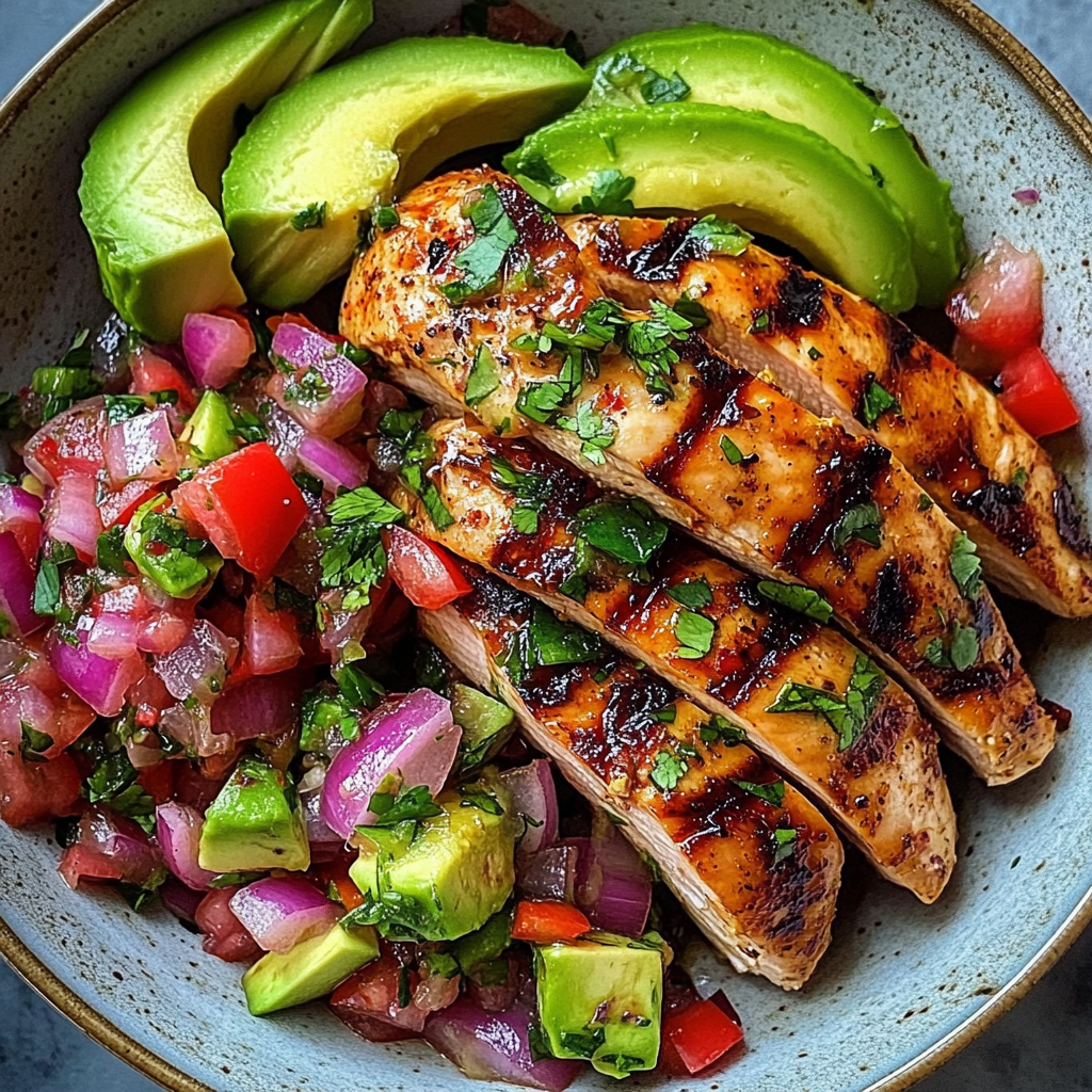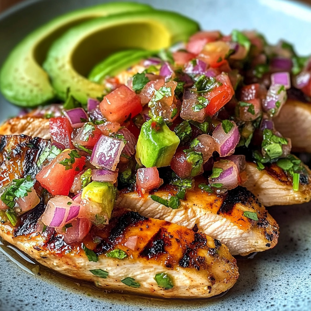 Enjoy vibrant flavors with Grilled Chili-Lime Chicken with Avocado & Red Onion Salsa – a zesty and satisfying meal perfect for any occasion!